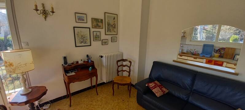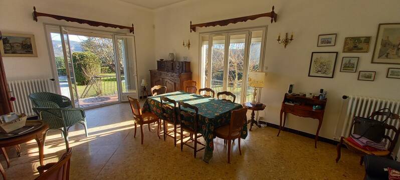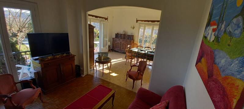 La salle à manger et le salon occupent une surface totale de 45m² dans une ambiance très lumineuse. En effet de nombreuses fenêtres et portes fenêtres permettent de faire rentrer la lumière naturelle dans ces espaces de vie. Il y a des stores et des volets roulant sur chaque fenêtres ce qui offre la possibilité d'atténuer les fortes lumières durant la periode estivale en juillet et aout.