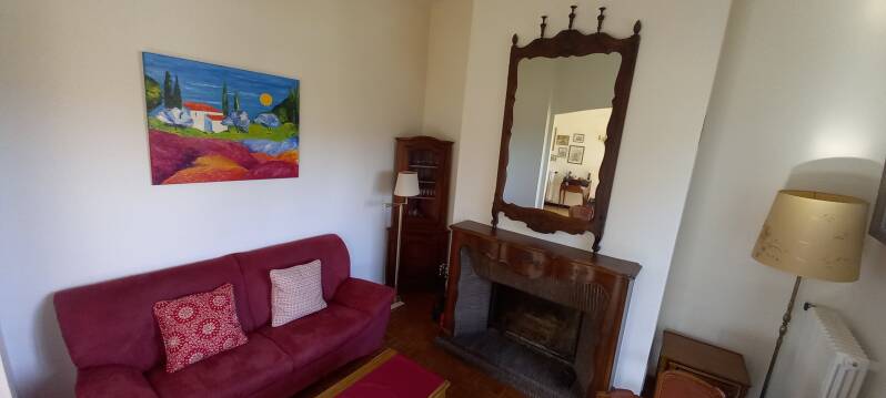 Le salon comprend en particulier l'espace TV et la cheminée sur un sol en parquet d'époque naturel (marqueterie)
